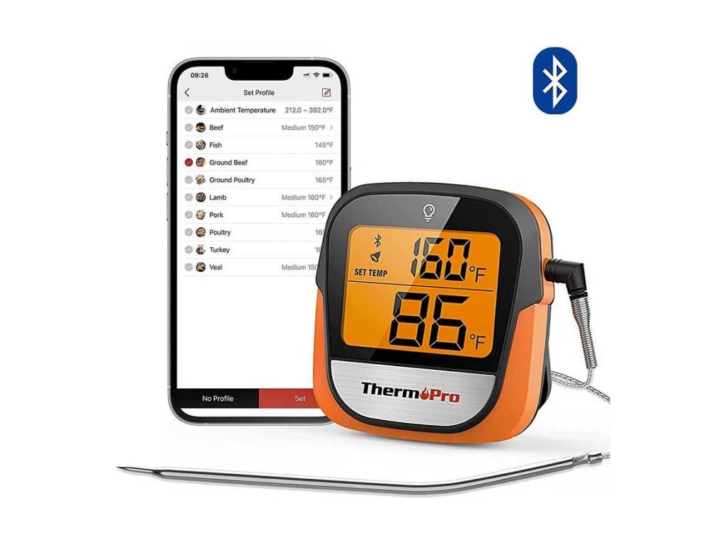 - Mobilní aplikace ThermoPro – sledujte teplotu, nastavte alarmy, využijte přednastavené profily pro různé druhy masa