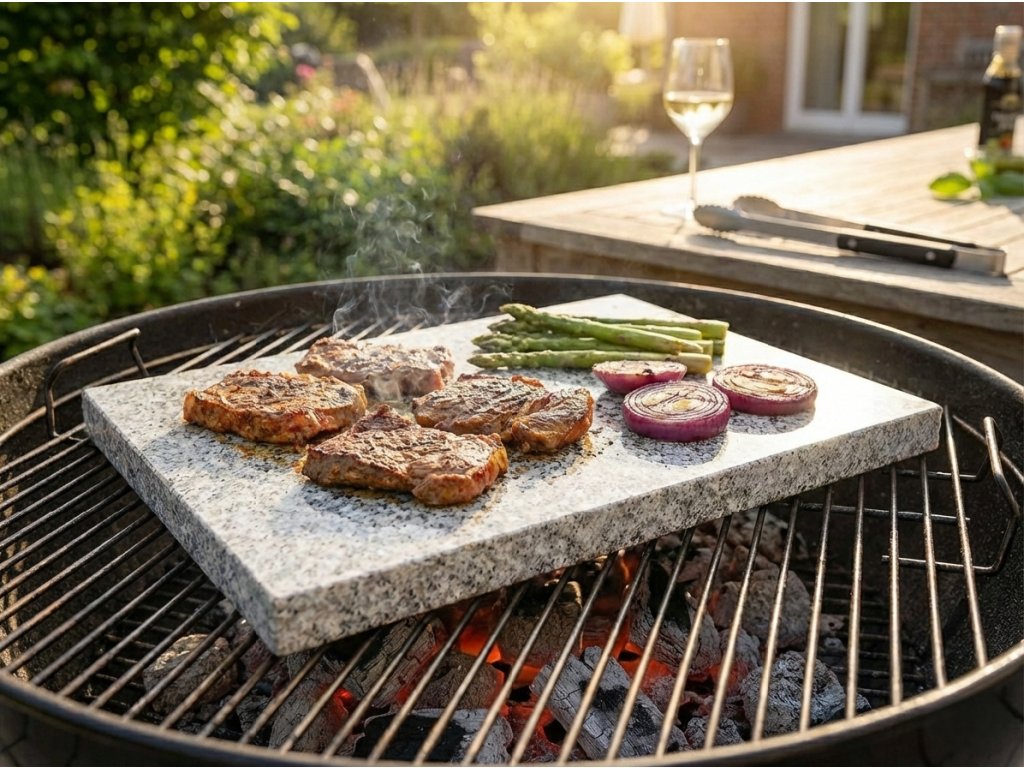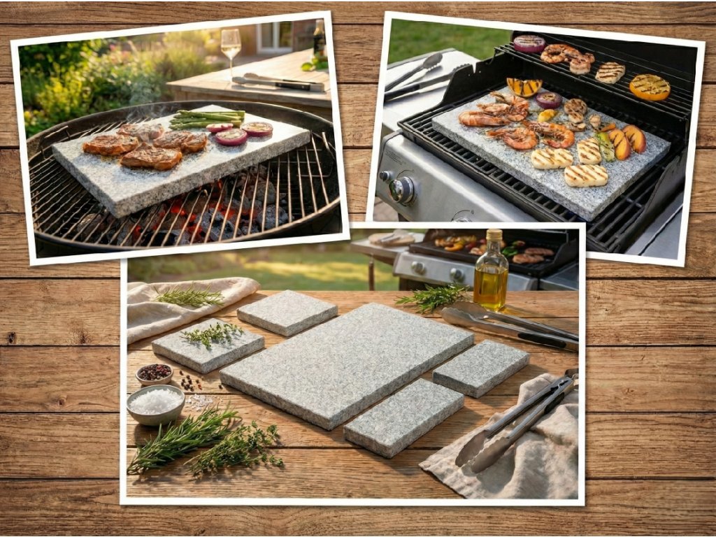 Grilování na žule má úplně jinou atmosféru než klasický rošt. Kámen se nahřívá pomaleji, ale když dosáhne správné teploty, odvede práci s neuvěřitelnou stabilitou. Žula nepálí, ale peče — a to je rozdíl, který poznáte už po prvním soustu.