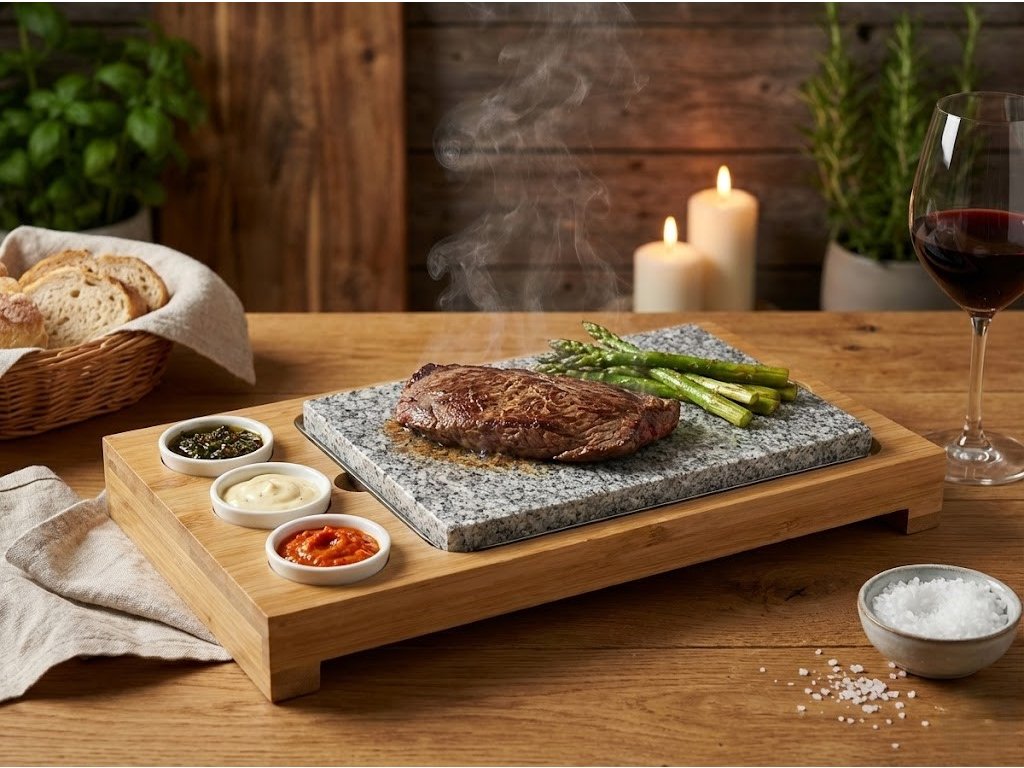 Žulový set je osvědčenou volbou pro každého, kdo chce začít s kontaktním grilováním na stole. Hladký, leštěný kámen v kombinaci s masivním dřevem a keramickými miskami vypadá na stole skvěle a posune vaše večeře na novou úroveň.